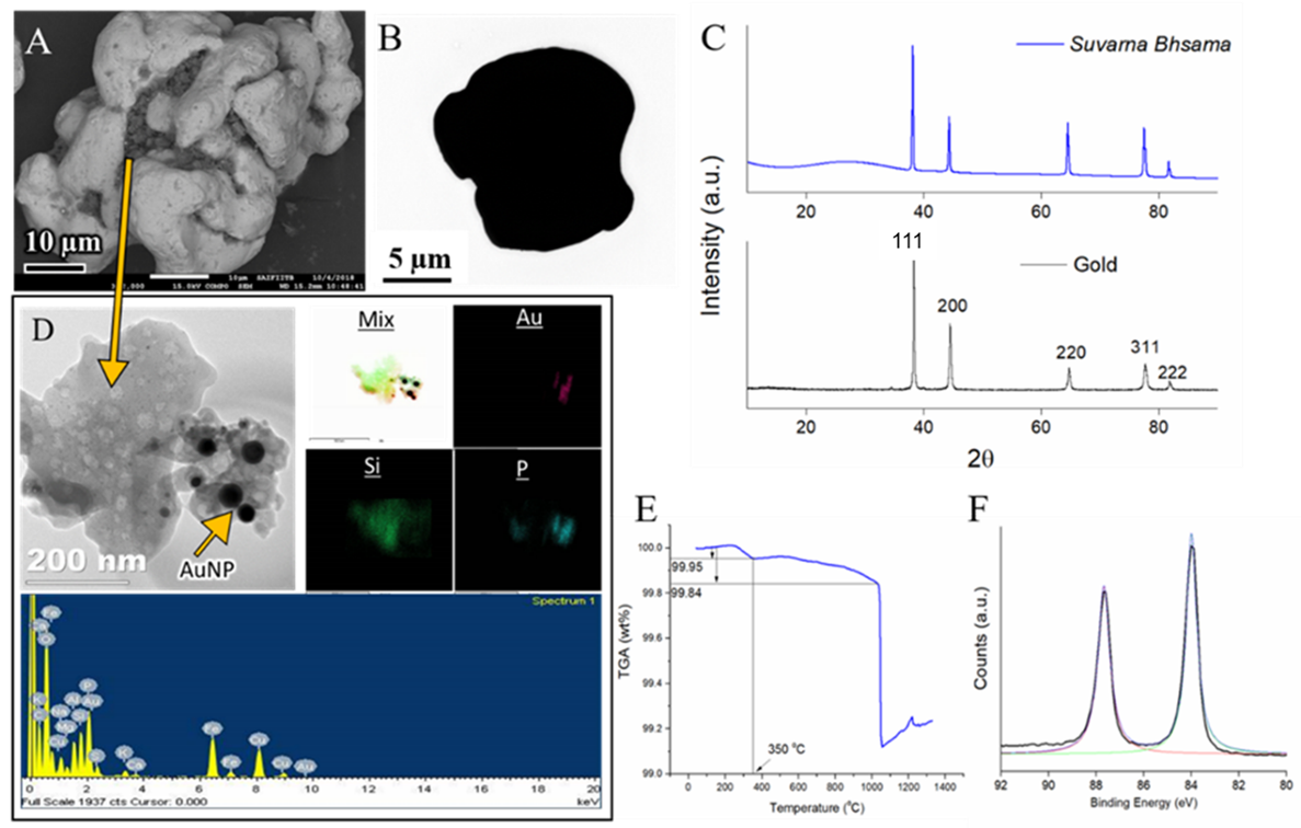 Application of metallic nano and sub-nano particles, commonly known as Bhasma, is the unique feature in Ayurveda. These medicines are being used for centuries, and still, the method of preparation of these Bhasma medicines is similar to the ancient Ayurvedic text. Essential elements like iron (Louha Bhasma, Mandur Bhasma), zinc (Jasad Bhasma), copper (Tamra Bhasma); toxic metal like mercury (Rasasindura), and lead (Naga Bhasma); and novel metal like gold (Swarna Bhasma) and silver (Roupya Bhasma) are widely practiced in Ayurveda as medicine. The research interest in Bhasmas medicine is increasing as it contains nanoparticles and has a broad spectrum of medicinal applications. Our lab has investigated numbers of Bhasma medicine through modern scientific experimentation. We have analyzed the physicochemistry of these traditional nanomedicines and found that the Ayurvedic process impart unique properties to these medicines as compared to lab synthesized nanomaterials.